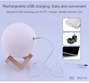 Moon lamp with the build-in rechargeable battery, you can recharge on your computer/power bank or charge adaptor etc. Fully charged in 2-4 hours, 8 hours of use.